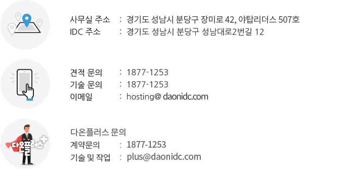 사업자등록번호 : 886-87-01137  대표번호(영업 및 견적문의) : 1877-1253   일반문의 : hosting@daonidc.com   다온플러스 : plus@daonidc.com